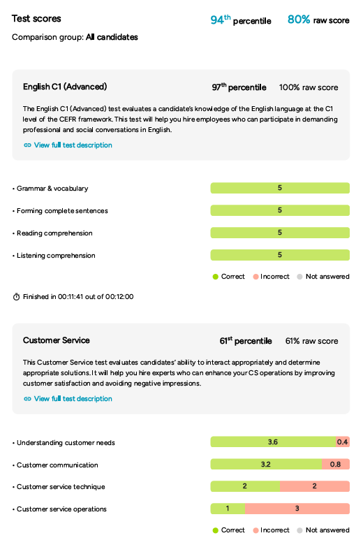 Attribute types measured include cognitive ability, skills, knowledge, personality characteristics, emotional intelligence, and past behavioral history. Note that these results should always be used as a part of a balanced candidate selection process that includes independent evaluation steps, such as interviews and reference checks.
